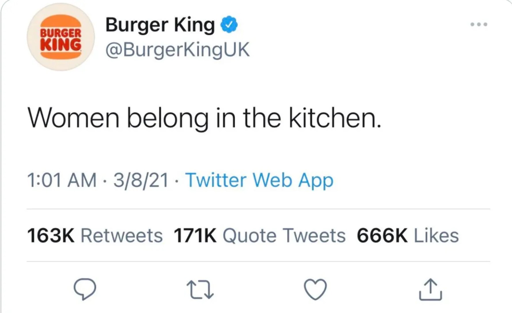 “Women belong in the kitchen.” That’s what Burger King’s United Kingdom division posted on X (then Twitter) on International Women’s Day back in 2021.