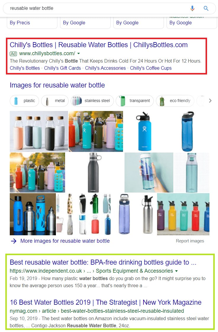 The image below shows an Ad, accompanied by the Google Ad logo, at the top of the screen. The two results underneath the image results are SEO content from authoritative websites.