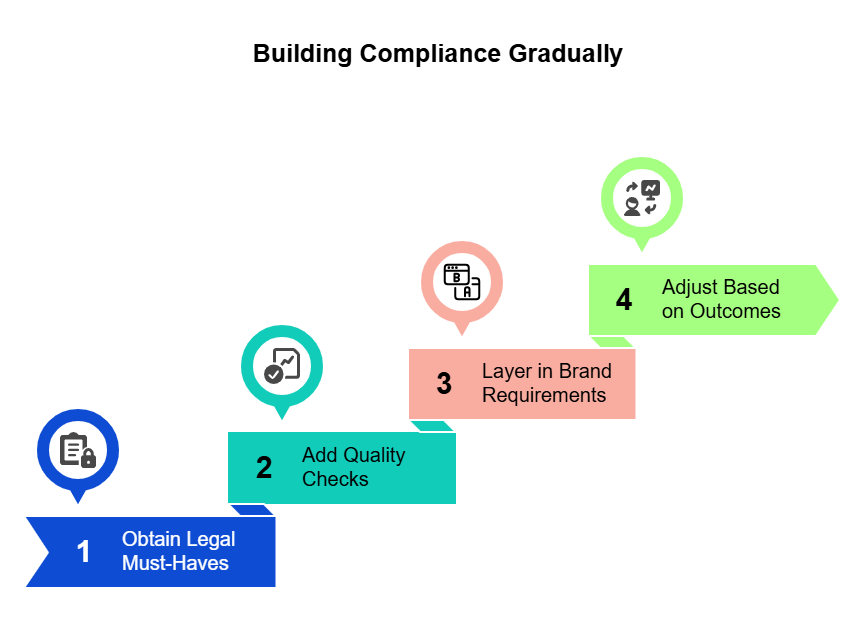 Nobody embraces sudden overhauls. Start with what matters most: accessibility standards that keep you out of court. When that becomes second nature, add quality checks for errors that damage credibility. Only after teams master those fundamentals should you enforce detailed brand standards.