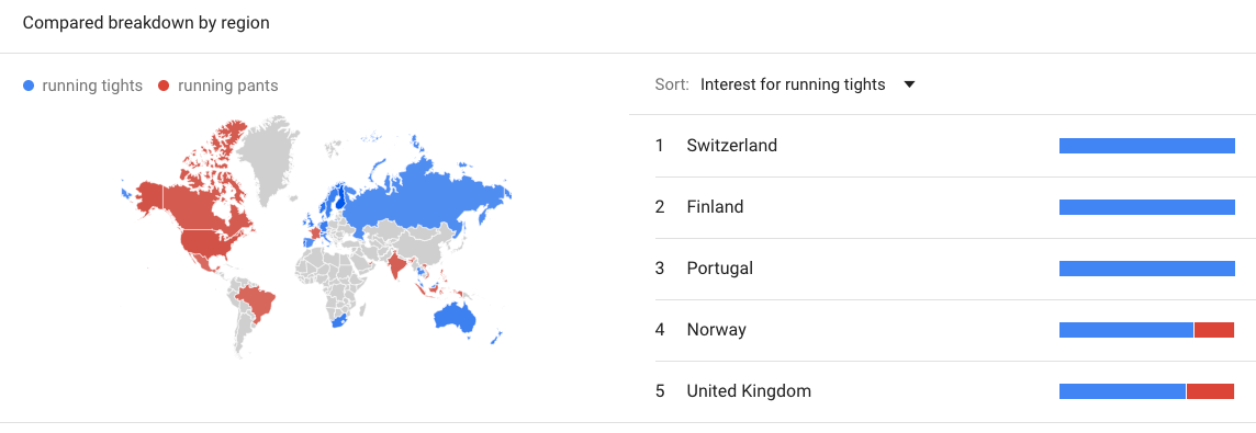Advanced tip: Use Google Trends to research local interest in your keywords. You can also use Google Trends to compare different phrasing of your product. For example, in the screenshot below, you can see “running pants” is the preferred search term in the US, while “running tights” is more common in Northern Europe. This allows you to geo-target your audience and use the keywords they find most relevant.
