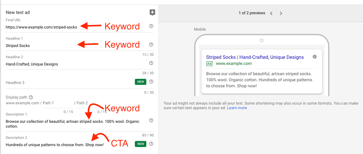 Once you’ve created your SKAGs, you can then tailor your ad copy to each keyword. Try adding your keyword in the URL slug, Headline 1, Description 1, and double check that you have a CTA in your description copy.
