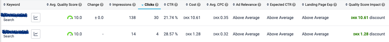 From here, you can click into a campaign to see your Quality Score on a keyword level, including cost penalties or discounts:
