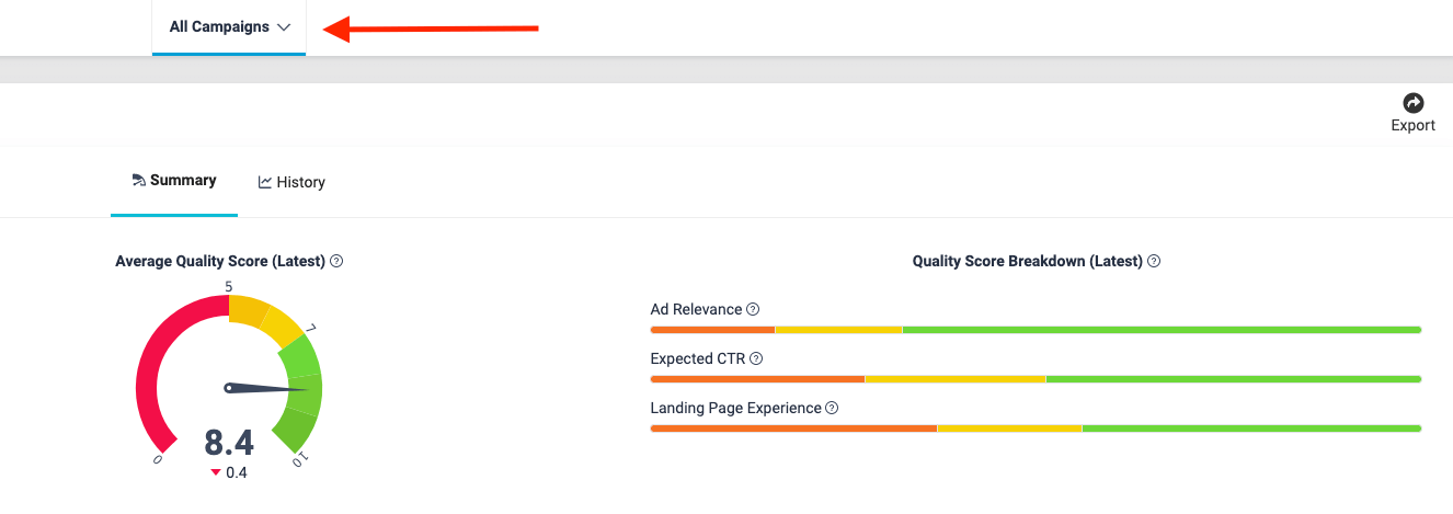 Select All Campaigns to see an overview at a campaign or account level. Scroll down to drill into Quality Score details on a campaign level.