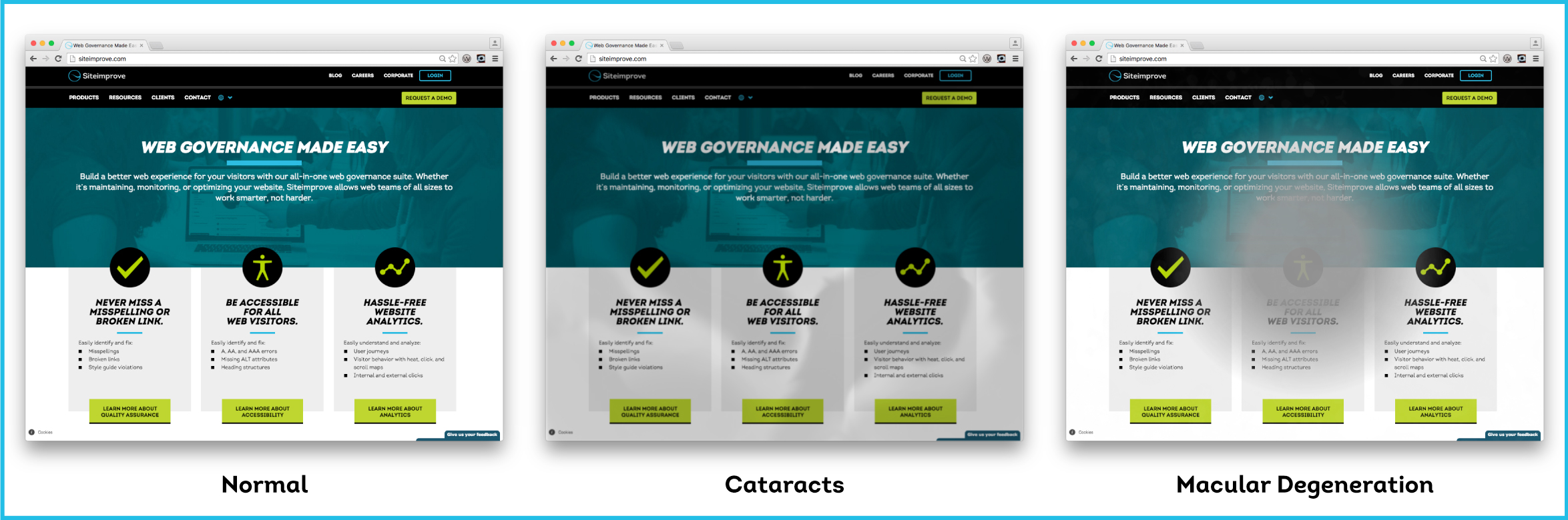 The other consideration with color, branding, and web accessibility is to think about the various vision conditions that affect people who may be interacting with your website.