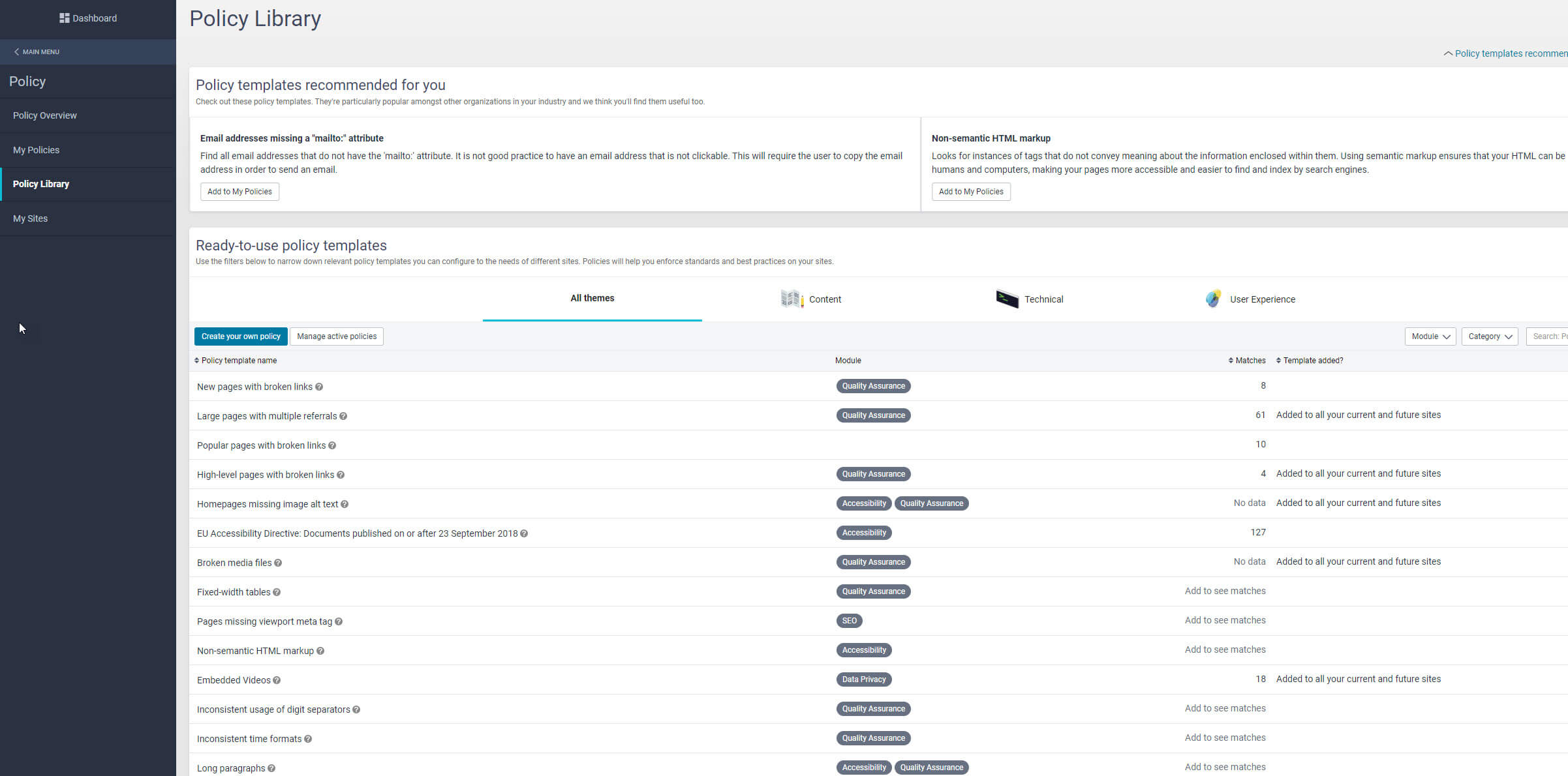 Thankfully, rolling out your website policies doesn’t require a great deal of up-front setup. To save you time, we’ve created a range of pre-built policies based on web governance best practices. You can quick-add these policies to your account to identify issues related to data privacy, content quality, SEO, and accessibility. Here’s what you can accomplish using Policy.