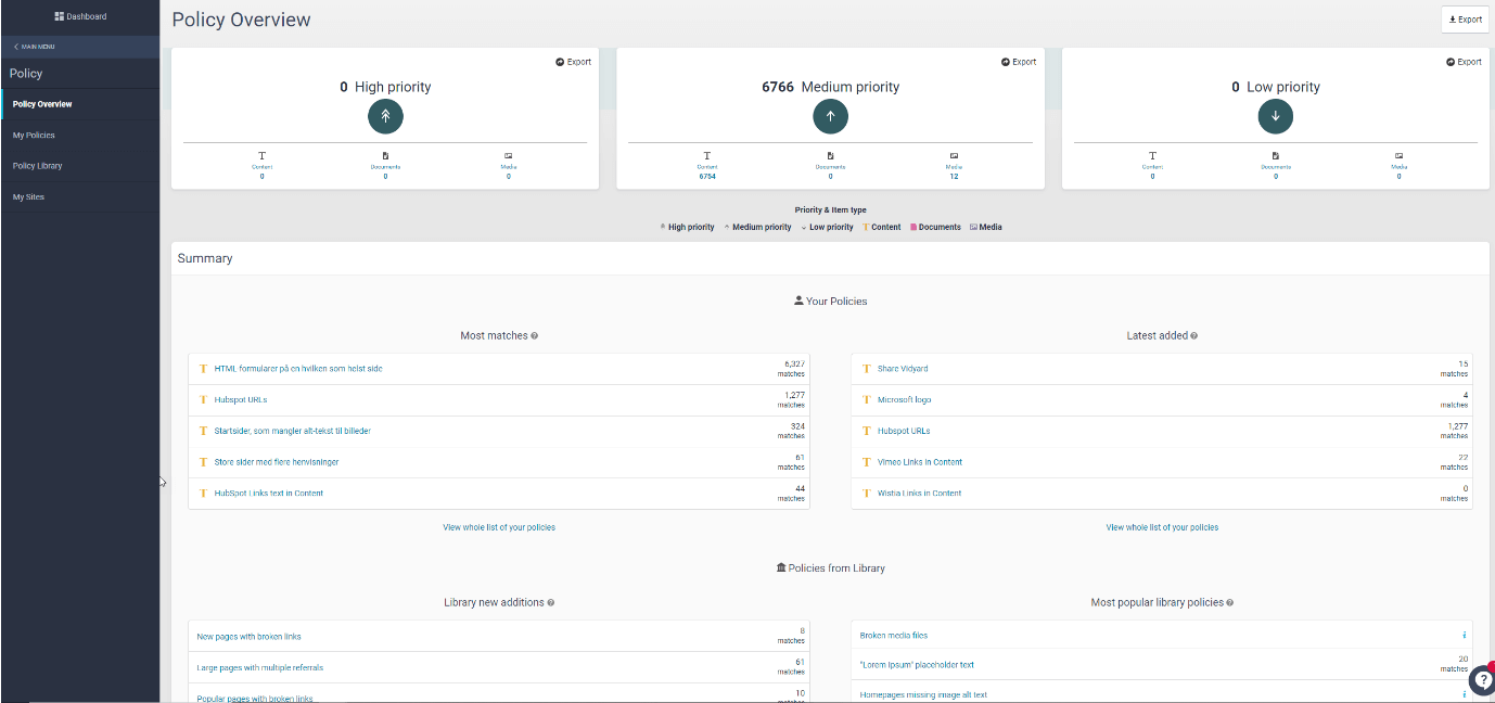 Policy Priority: Here you can see how your policies have been prioritized. This allows you to focus on the high-priority issues first. Types of policy violations (Content, Document or Media) are displayed within each priority section. This gives you a quick overview of the total number of policy violations on your website.