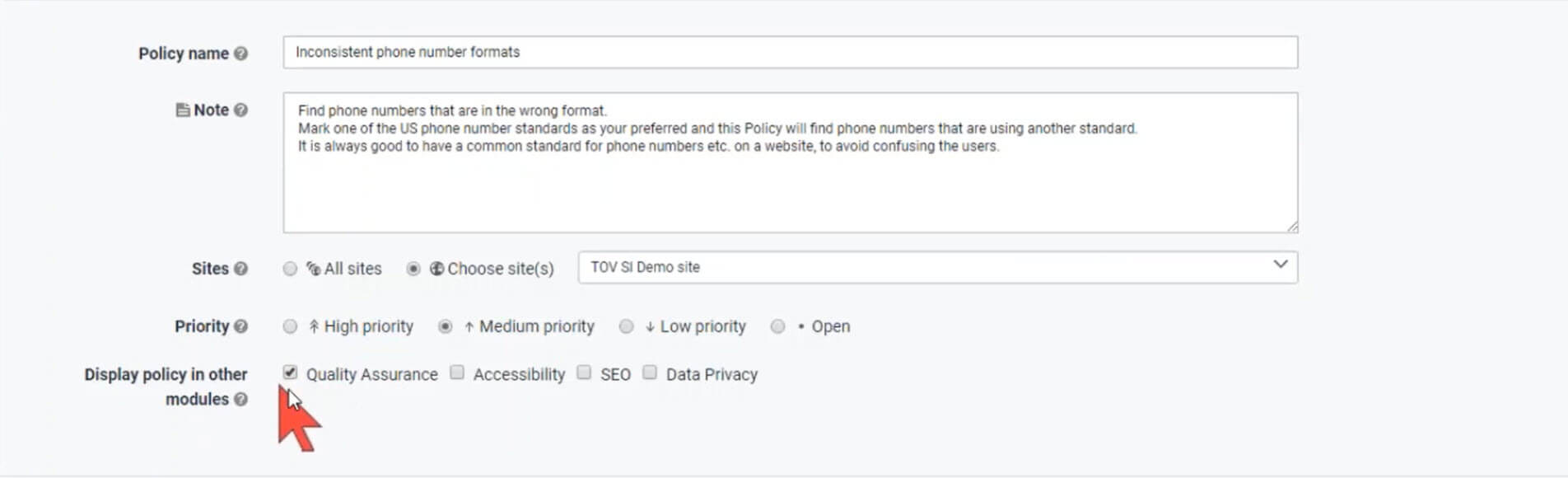 Tip: You can view your policies in other Siteimprove modules. Simply open a policy, then select the desired ‘display policy in other modules’ option. It will then be found under the ‘Summary’ section of that module.