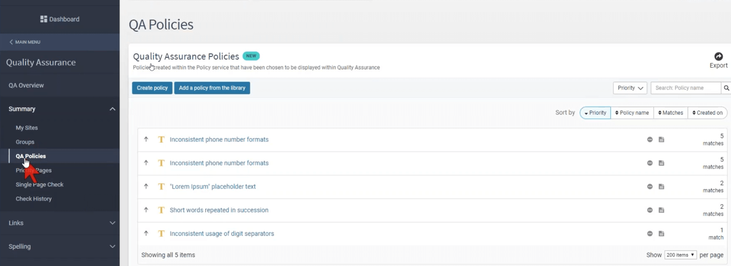 Customized policies. We know that every website has internal, specific rules. That’s why it’s also possible to create checks tailored to your organization’s needs from scratch, for example, finding all instances of a legacy product name on your website so they can be archived, or confirming all content is consistent with US English spelling. Learn how to create a custom policy on our Help Center.