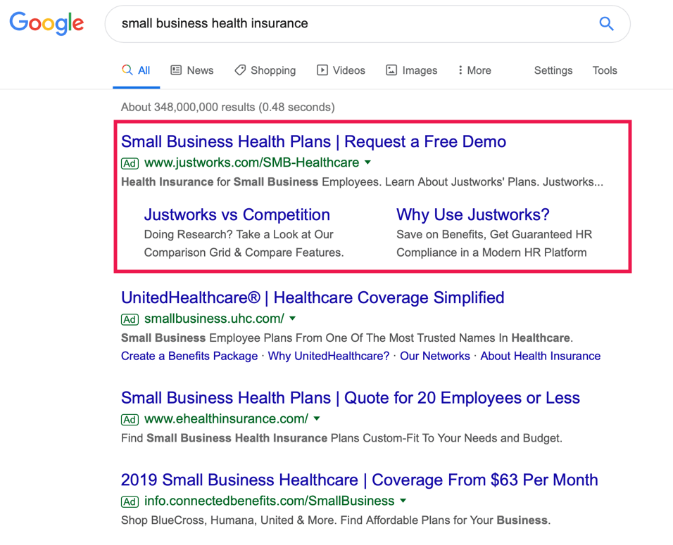 Take a look at the first ad on our SERP from Justworks. This does a good job of matching the ad copy to the search query. The headline uses a related keyword phrase “Small Business Health Plans,” and the body includes the queried keywords “Health Insurance” and “Small Business.” In addition, the ad includes related words such as “employees,” “benefits,” and “HR compliance” that are likely important to an employer.