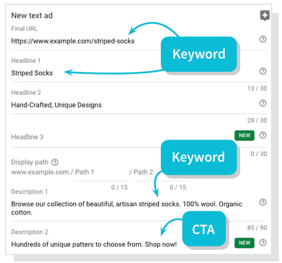 When it comes to keyword placement, try adding your keyword in the URL slug, Headline 1, Description 1, and double check that you have a CTA in your description copy (more on CTAs later):