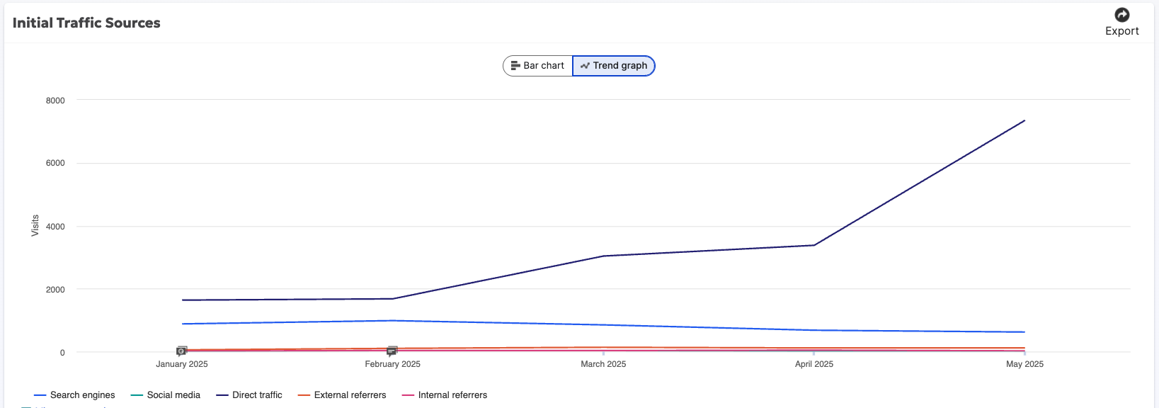 Referral traffic shows how many visitors came to your site by clicking a link on another website. It helps you understand which partnerships or mentions are driving results.