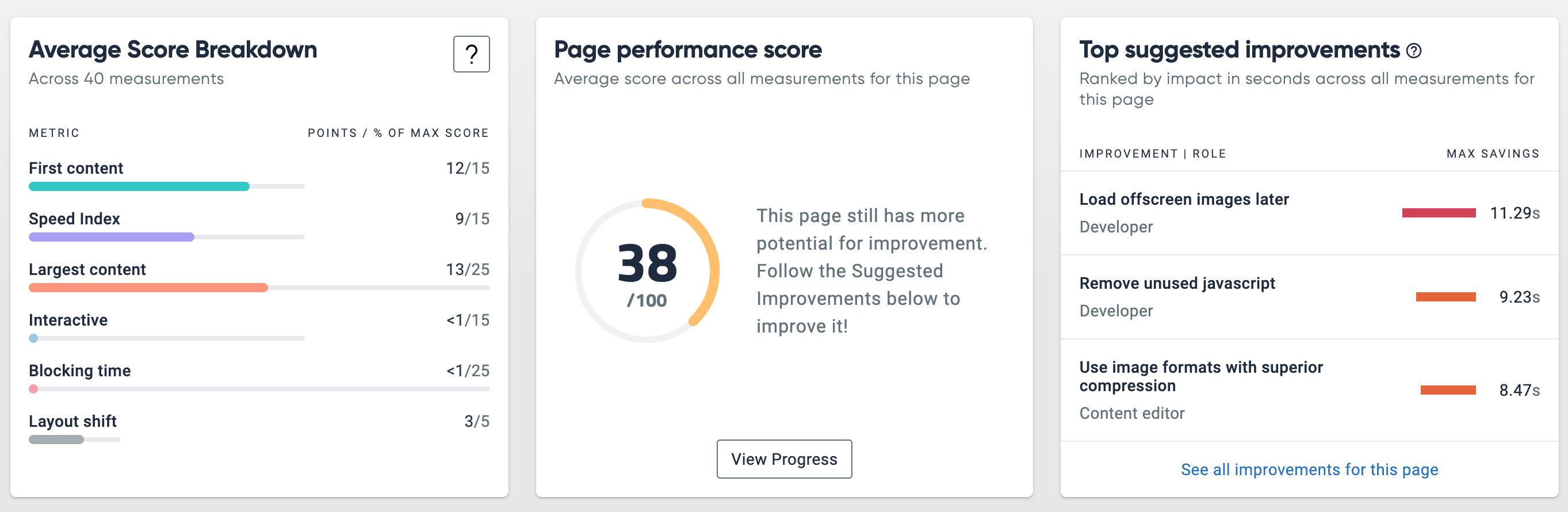 Click into each suggested improvement for technical instructions on how each issue should be tackled, by whom, and how many seconds of performance you stand to gain by resolving it.