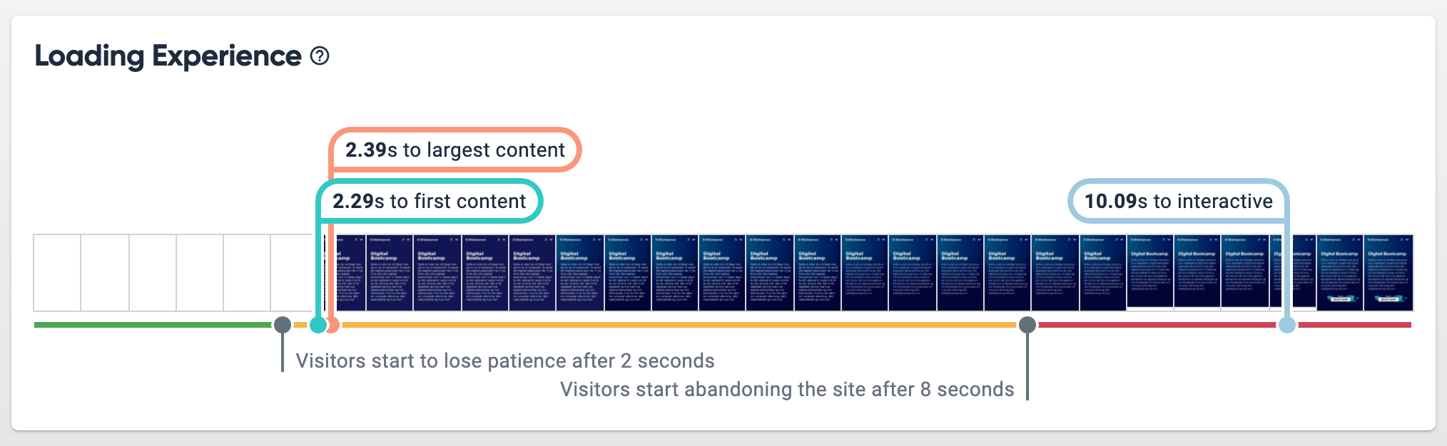 First, click into ‘Loading Experience’ to see a timeline of these metrics at work. Use it to break down each page’s loading experience into individual frames and simulate a blow-by-blow account of what your visitor sees as the page loads.