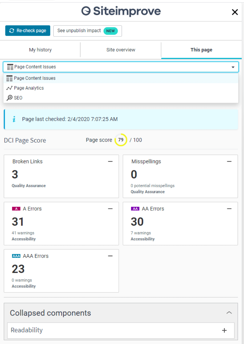 The Siteimprove CMS plugins deliver Siteimprove insights directly inside of your CMS platform based on the last crawl of the page. You can see how your pages perform in areas including Quality Assurance, Accessibility, SEO, and custom policies. Data on the impact of unpublishing or deleting a live page is another helpful feature. You can see the impact of unpublishing for documents that only exist on a specific page, or a page that contains valuable backlinks. Many of our plugins also trigger an immediate (re-)crawl of a page when it is published, giving the editor fast feedback on the changes or new additions to their site.