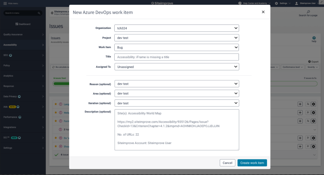 Siteimprove’s task management integrations enable you to identify and delegate issues within the applications you use every day, speeding up remediation and fostering collaboration. This works by transferring Siteimprove data into a range of leading project management solutions, including Jira and Azure DevOps, for end-to-end project management.