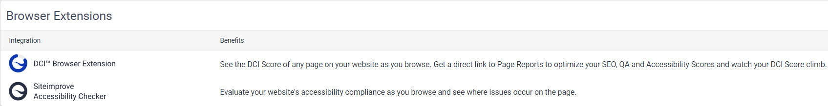 - Siteimprove DCI Browser Extension: lets you see the DCI Score of any page on your website and gives a direct link to Page Reports to optimize your SEO, Quality Assurance, and Accessibility Scores.