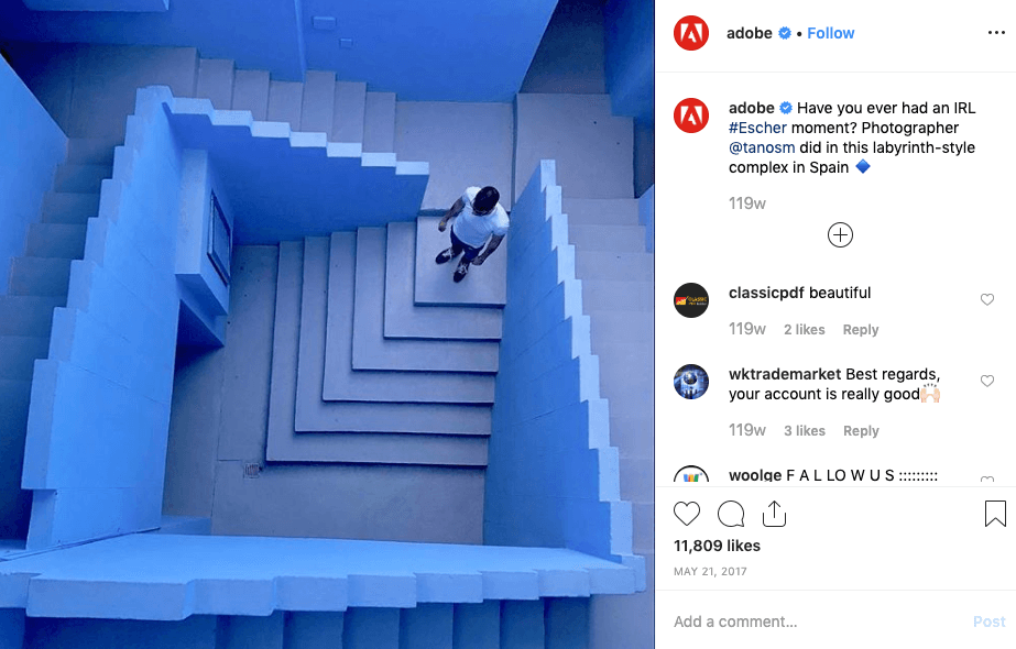 Adobe has a very effective user generate content campaign. Using the hashtag #Adobe_Perspective, artists and other content creators share photos on Instagram that showcase the ways in which they use Adobe to do their jobs.