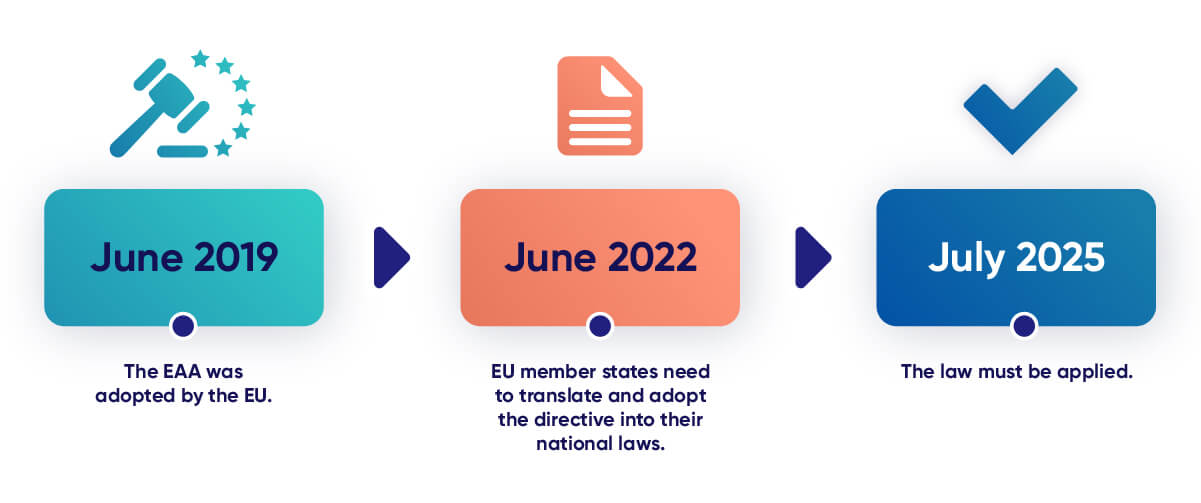 The EAA was adopted by the EU in June 2019. By June 2022, EU member states need to translate and adopt the directive into their national laws. As of June 28, 2025 the law is enforced.