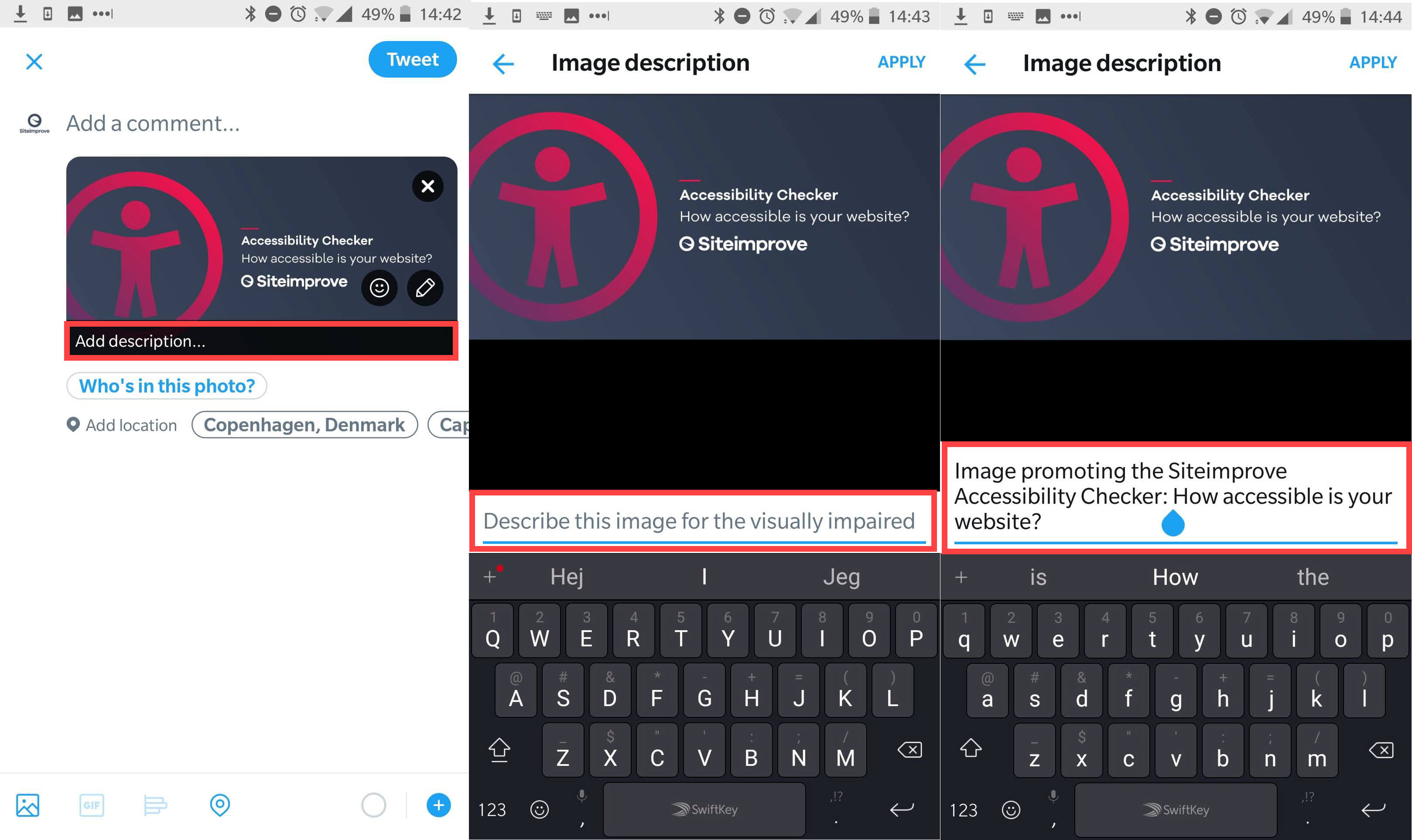 Android User klicken einfach das Symbol am oberen Bildschirmrand. Tippen Einstellungen und Datenschutz an und dann auf die Option Barrierefreiheit unter Allgemein. Setzen Sie den Haken neben Bildbeschreibung verfassen, um diese Funktion zu aktivieren. Das nächste Mal wenn Sie einem Tweet ein Bild hinzufügen, klicken Sie einfach auf Bildbeschreibung hinzufügen und schreiben Sie Ihren Text und beenden Sie mit Anwenden.