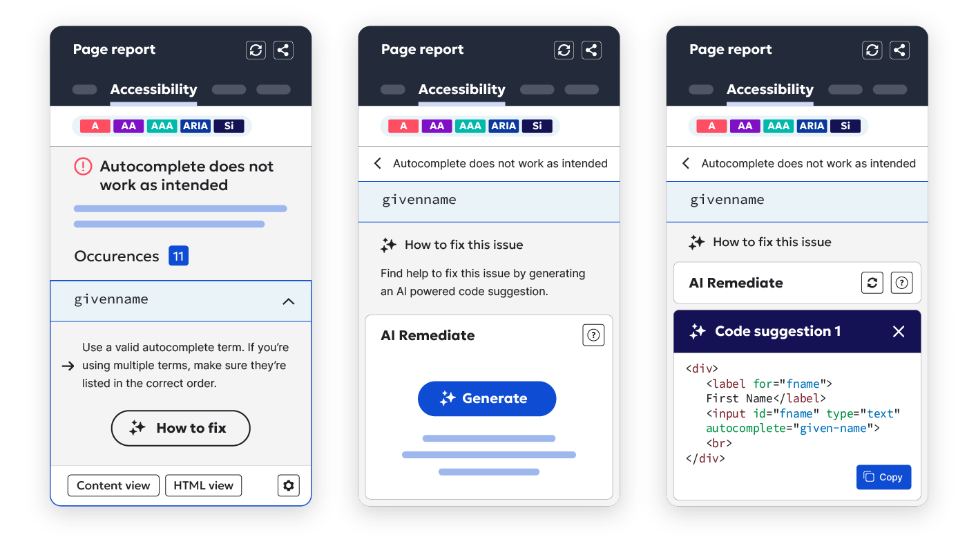 By delivering context-specific code recommendations for any accessibility issues detected on your site, AI Remediate eliminates time-consuming guesswork. Presto, you can direct the time you save to creating engaging user experiences that drive business outcomes.