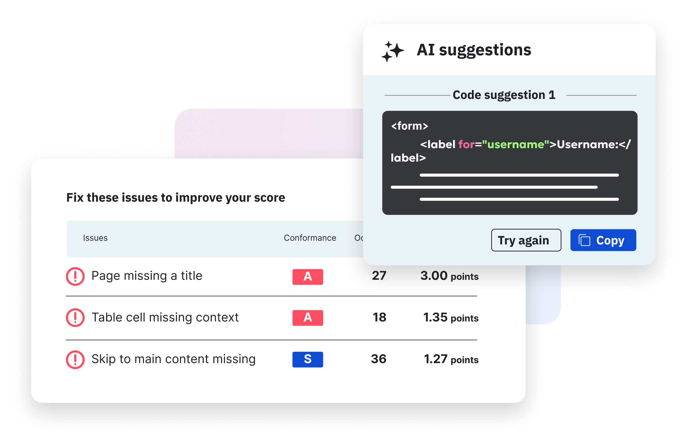 Run accessibility testing directly in your favorite test framework and CI/CD tool, and benefit from clear explanations of issues and advice for remediation, including context-specific AI-based code recommendations that have already passed accessibility checks. The best part? Forget about jumping back into past projects to fix issues that were originally missed.