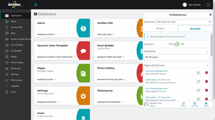 Contact LRS Web Solutions to Enable the PluginThe Siteimprove CMS Plugin bridges the gap between the LRS Antilles content management system (CMS) and the Siteimprove Intelligence Platform. Now you can scan your website for errors as soon as a page is published, allowing you to fix mistakes, optimize content, and manage your site more efficiently.