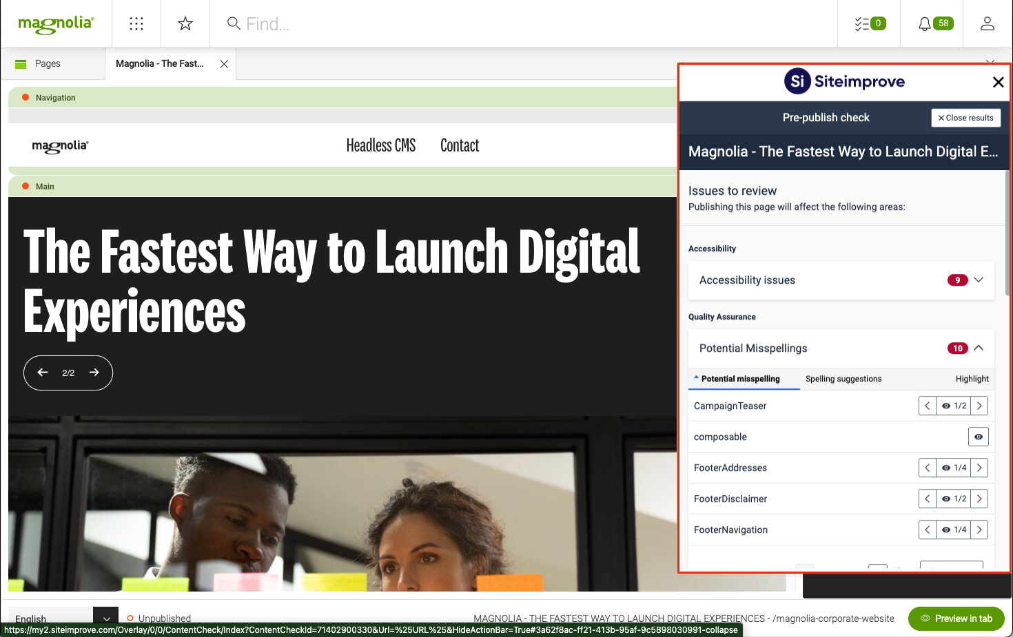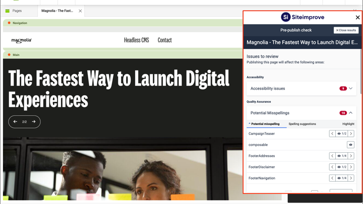 With Siteimprove Prepublish, customers can create frictionless digital experiences optimized for SEO and accessibility before pressing publish (and without leaving the Magnolia platform).