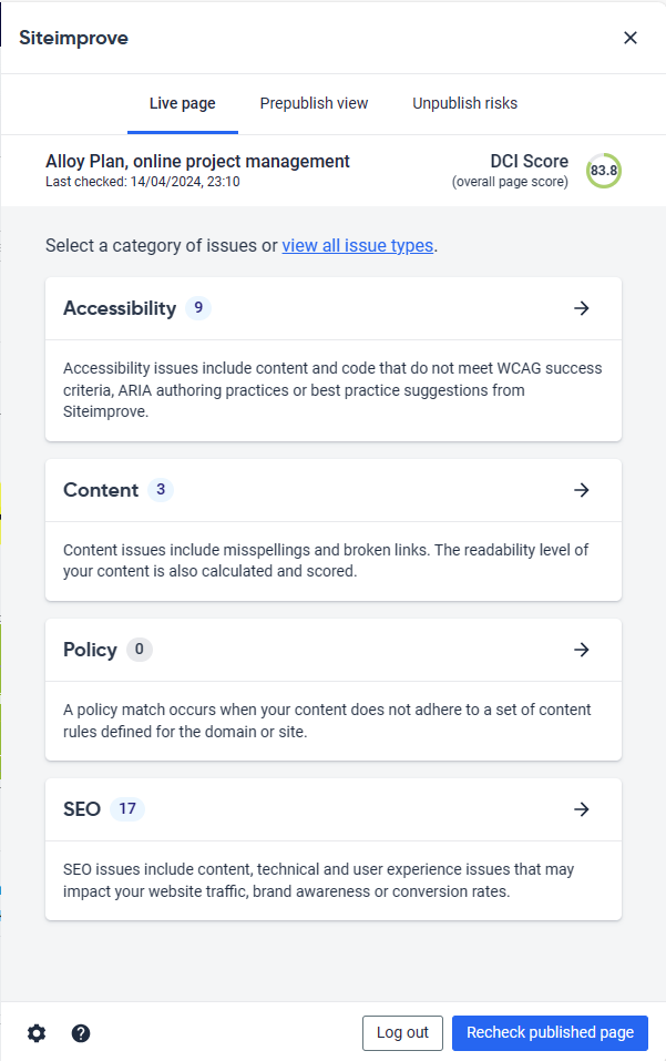 With the Siteimprove integration, you can see potential errors directly in Optimizely. Once errors are resolved, your content will be recrawled to see how the page has improved.