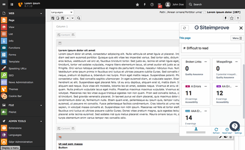 Content quality and integrity are important to many of our customers. When editors manage large amounts of content across several websites and in diverse languages, you need an automated way to monitor your content. Siteimprove delivers a great solution — and it is getting better every day. The software is in active development, steadily gaining new and useful features.