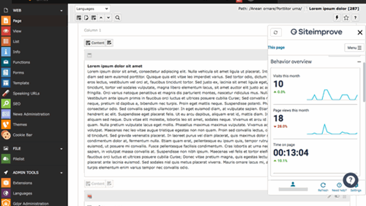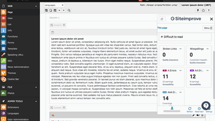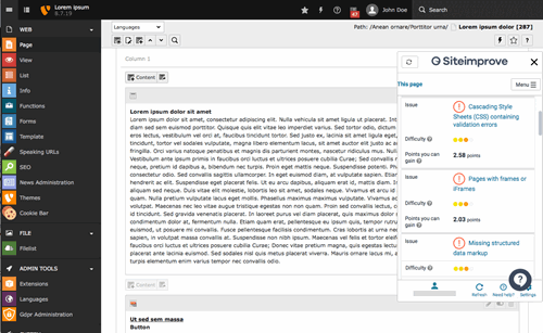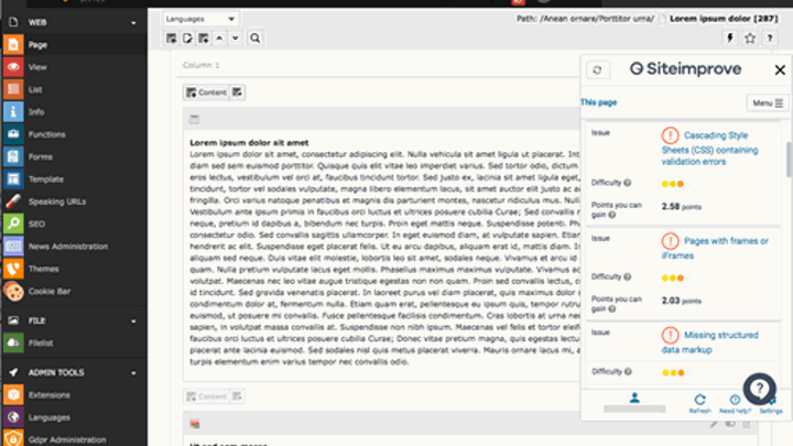 While TYPO3 allows you to manage complex sites in a structured way, you still have to ensure content quality and comply with policy and legal requirements. Integrating Siteimprove into TYPO3 places the powerful analysis tools at the editor's disposal directly within the CMS, saving time and making site improvement an integral part of the content management workflow.