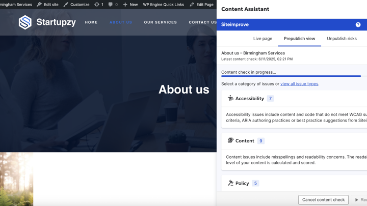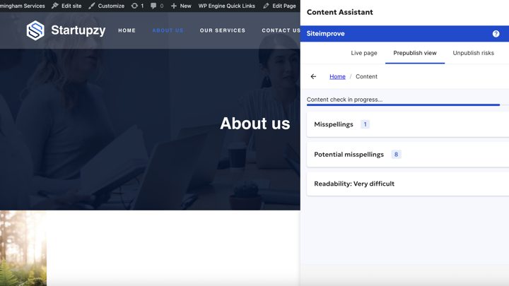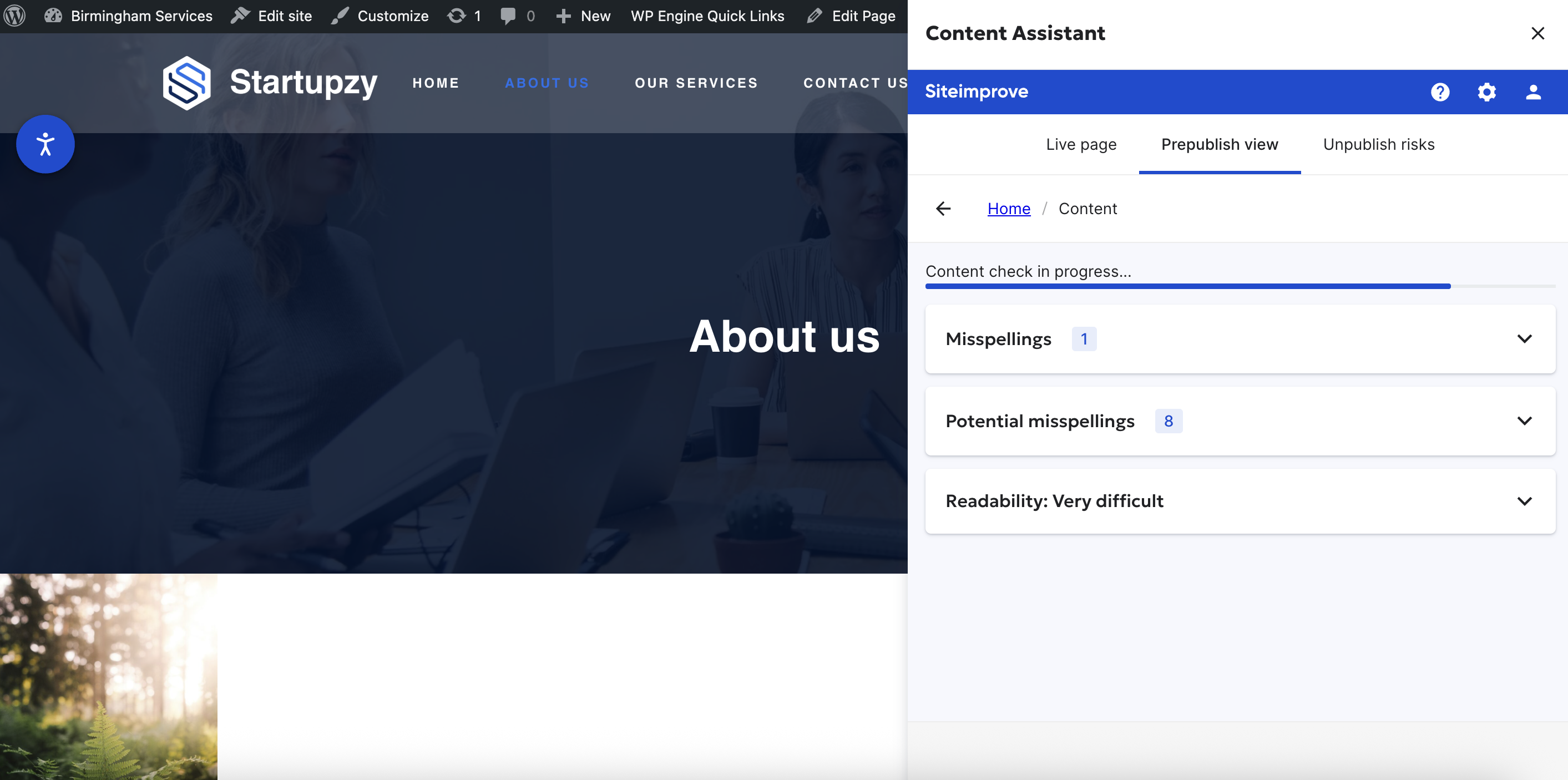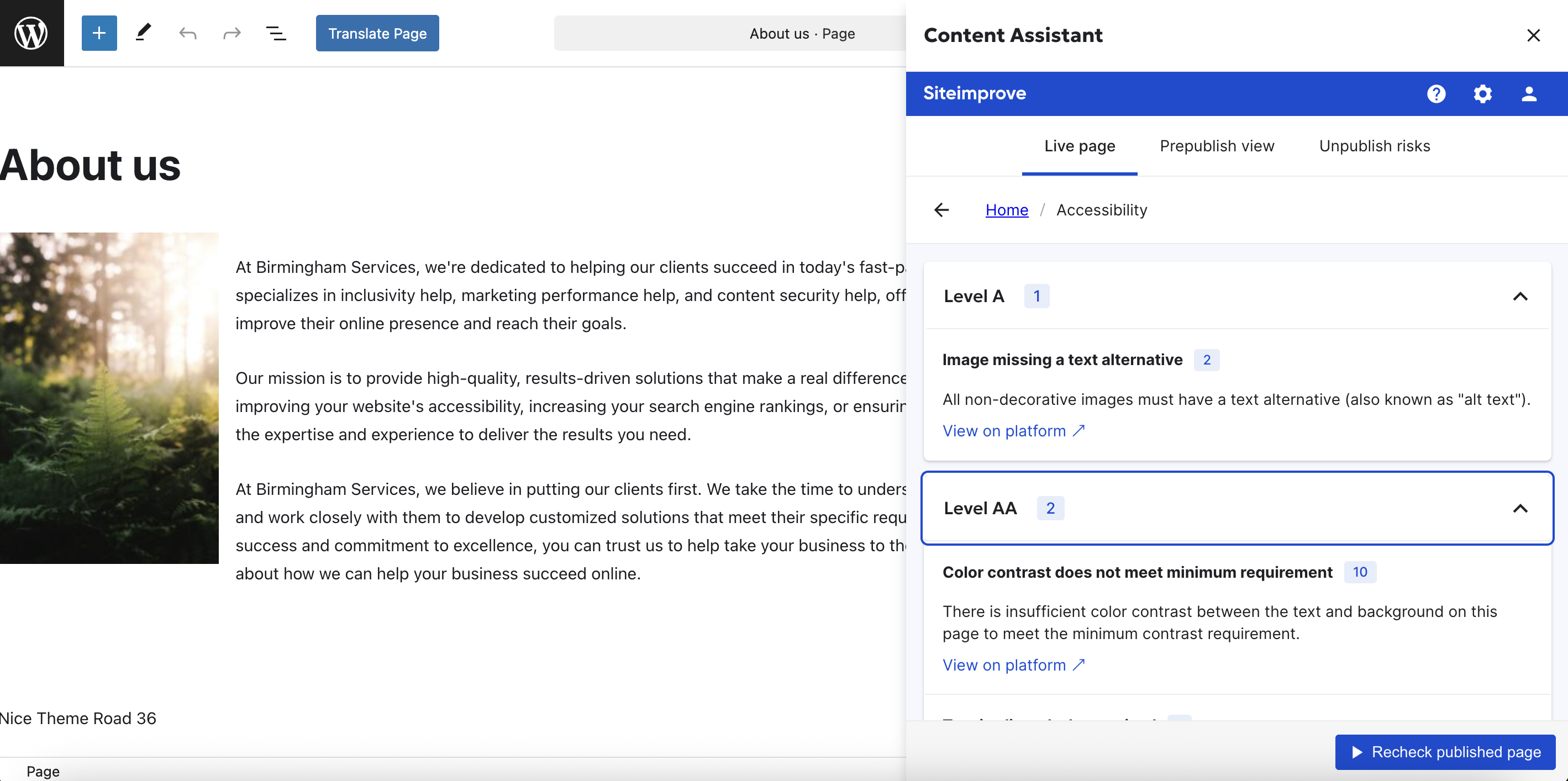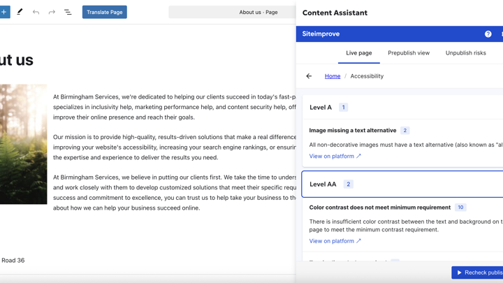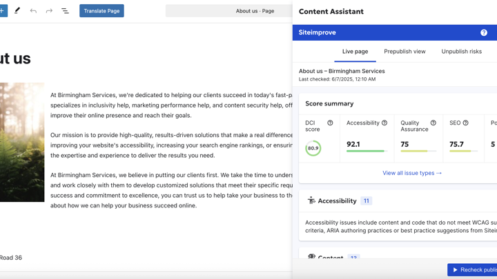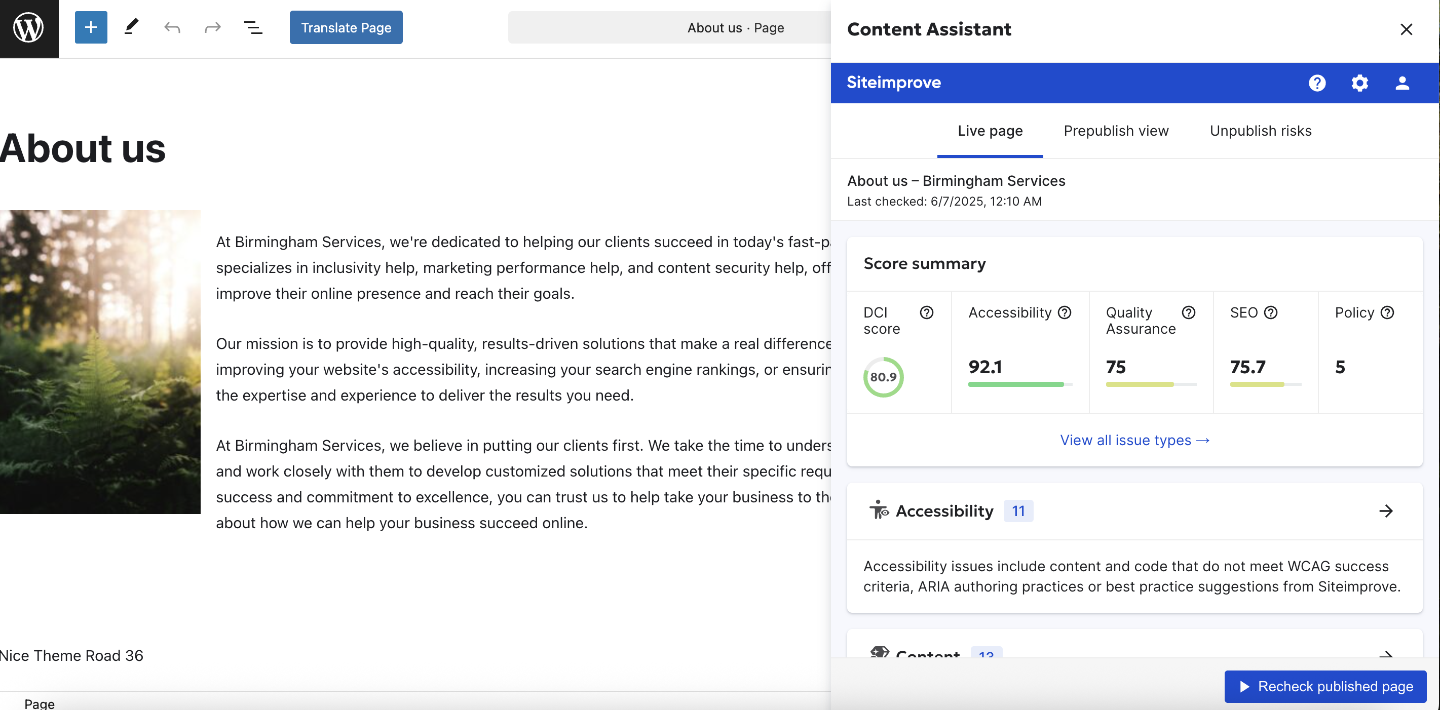 The seamless integration between Siteimprove and WordPress streamlines workflow efficiencies for your web team. With the plugin, your team can fix errors and optimize content directly within the editing environment. Once the detected issues have been assessed, you can re-check the relevant page in real-time and determine if further actions are needed.