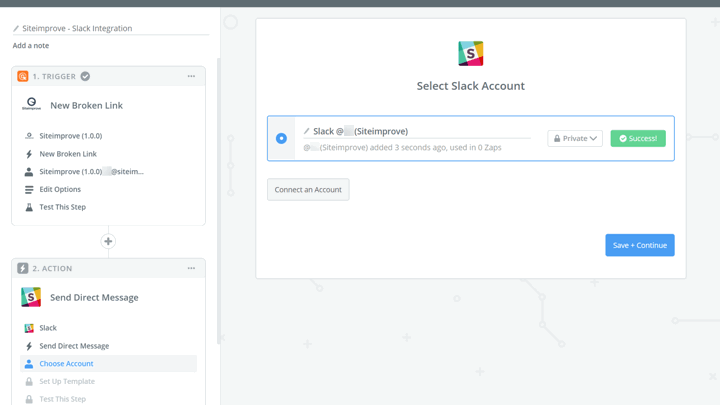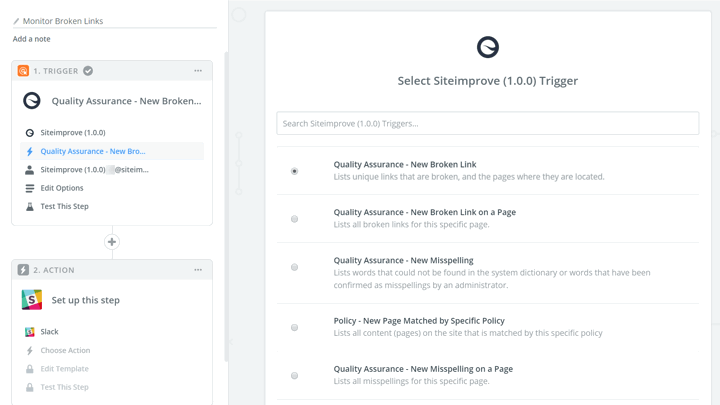 How does the Zapier Connector work? Siteimprove detects misspellings, broken links, policy matches, and other issues from QA, and it passes this information to Zapier. Within Zapier you can configure a chain of actions that will automatically occur when these website issues are detected.