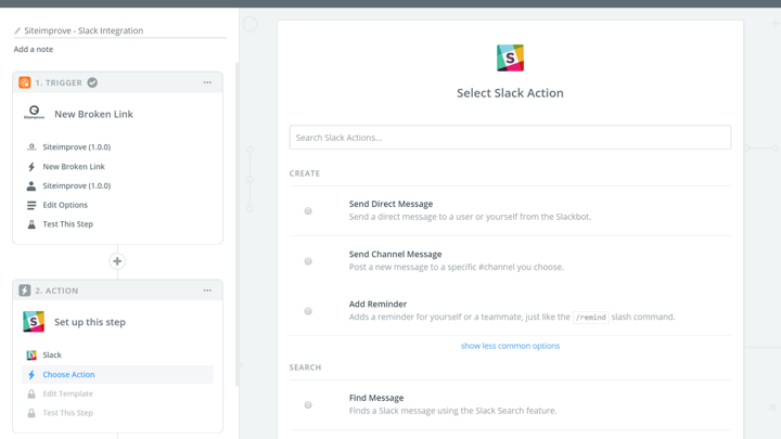 • Get alerts and notifications: If you want certain members of your team to get notified when something on your website needs to be fixed, then this connector is exactly what you need. Zapier gives you the possibility to trigger automatic actions when certain website issues are detected. For example, you can receive a Slack or an email notification for critical issues, such as a broken link on your homepage.